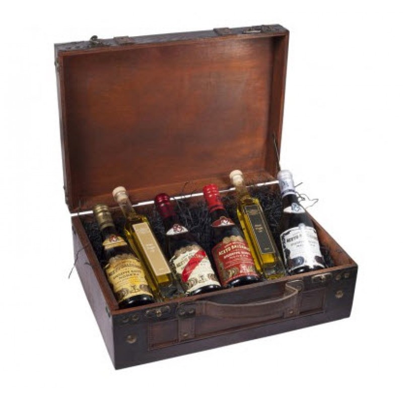 • This is a hamper for chefs and real food lovers - one of our old-style suitcases containing four premium bottles of Giuseppi Giusti balsamic vinegar ranging from six to 20 years in age, along with two deluxe gift bottles of truffle oil in white and black. Say hello to gourmet restaurant flavours in your own home kitchen.